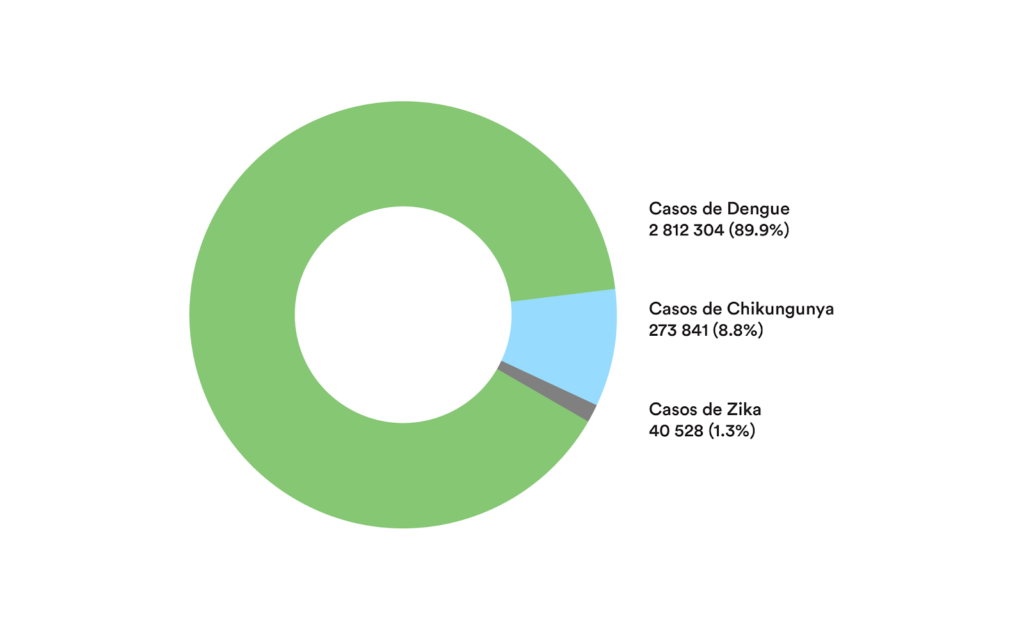 Según el Boletín anual de arbovirosis de la Organización Panamericana de la Salud (OPS), en 2022 se notificaron un total de 3.126.673 casos de enfermedad por arbovirus. De estos, 2.812.304 (90,0%) fueron casos de dengue, 273.841 (8,8%) de chikungunya y 40.528 (1,3%) de zika. Se ha estimado que hay más de 250 millones de personas en todo el mundo con riesgo de padecer estas enfermedades, y que cada año se producen aproximadamente 100 millones de casos, entre los cuales 500.000 corresponden a dengue hemorrágico.